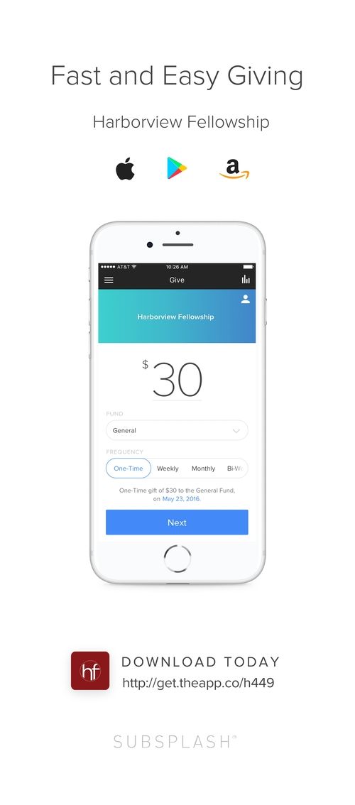 Thank you for being a part of Harborview Fellowship Church. Your donations are used to support, grow, and advance God’s kingdom through a number of ministries at Harborview Fellowship including Children and Youth ministries, Outreach, Missions, Operations, and Jesus Ministry training both locally and globally.